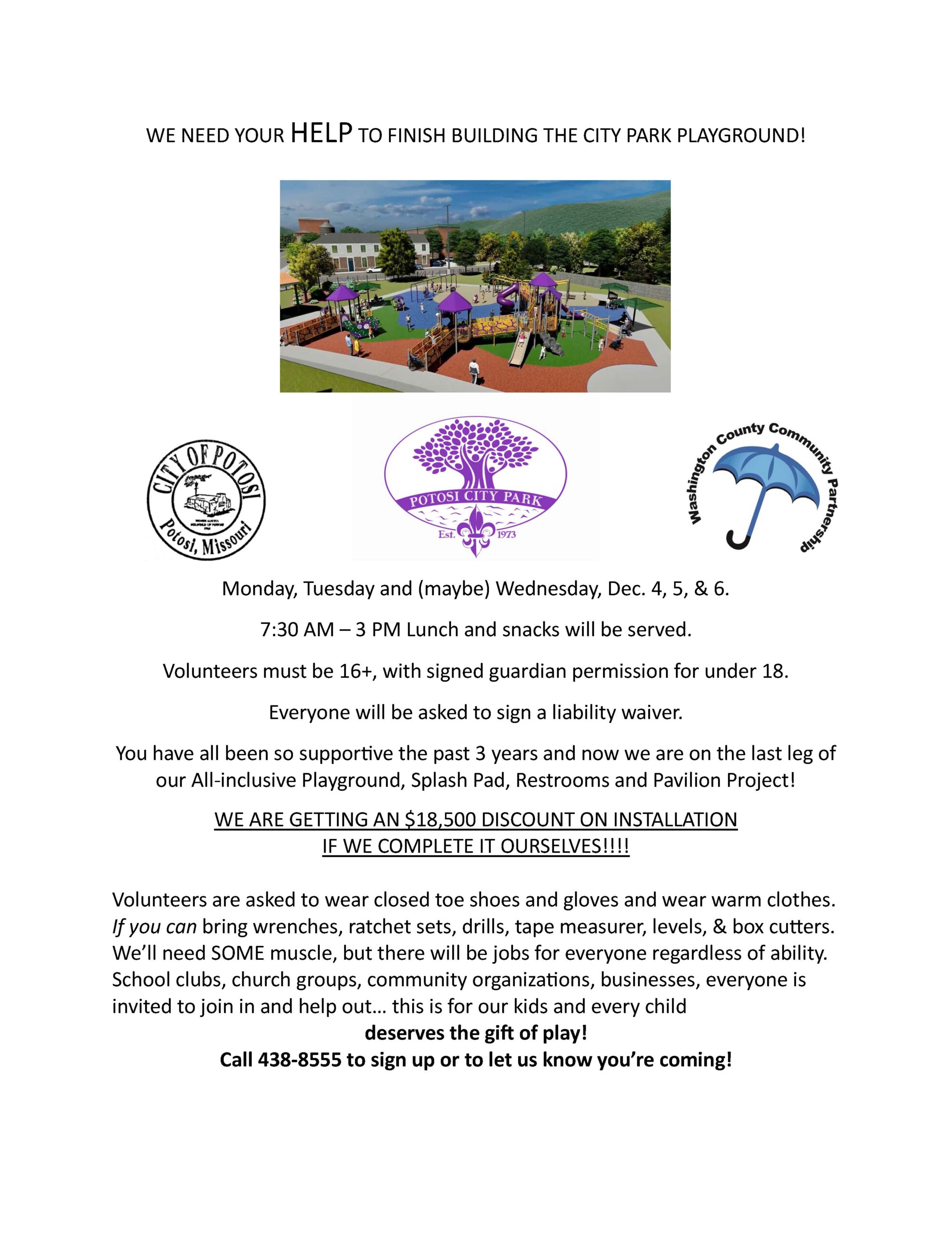 WE NEED YOUR HELP TO FINISH BUILDING THE CITY PARK PLAYGROUND Angella King2023-11-28T13:36:03-06:00 This page is easy to share... choose your platform. FacebookXLinkedInPinterestEmail